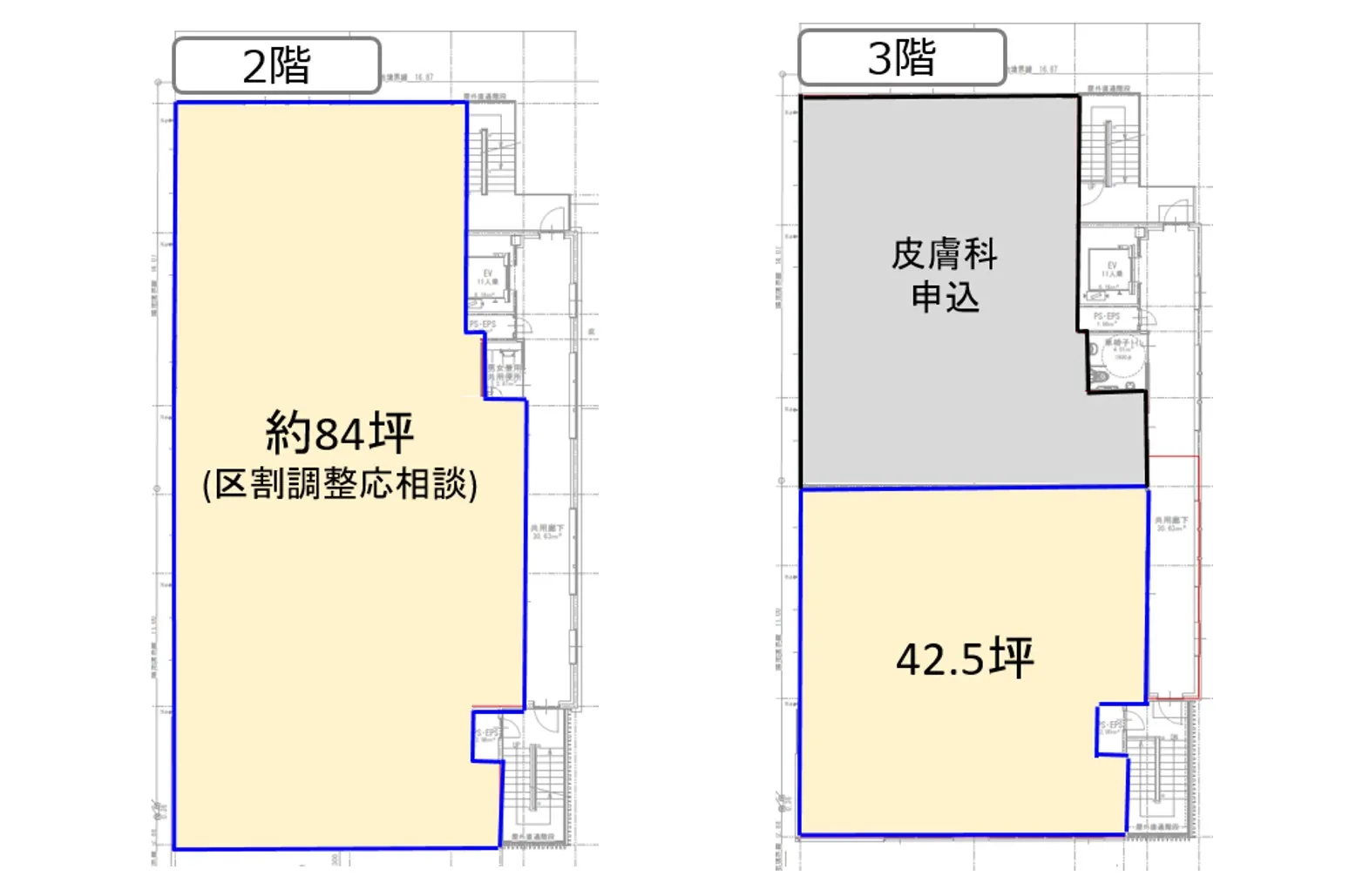 募集区画・面積 2階:約84坪(区割調整応相談)、3階:42.5坪
